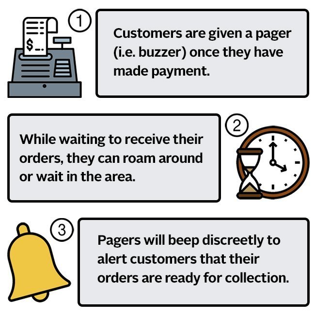 As our pagers are portable, the Customer Paging System comes in handy when customers are waiting for their food. Instead of having to stay at a particular spot, they are able to walk around to pass the time – they can even run a quick errand or two! Once their food is ready, an employee will notify them by activating the pager (which buzzes discreetly). Allowing your customers to collect their own food not only presents them with a sense of autonomy and empowerment, but also allows for better staff labour allocation.