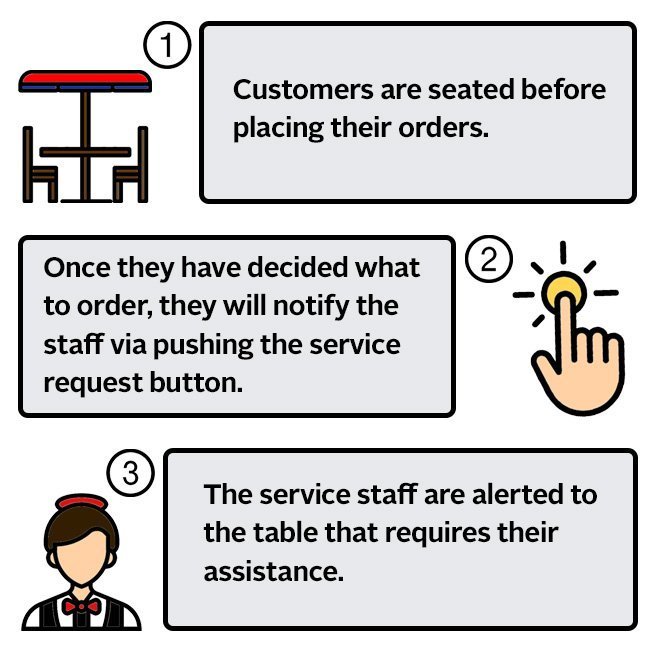 A staff paging system or a guest paging system? Why not both? The service request system is applicable for use 1. Within employees, and 2. Between customers and employees. A simple and convenient set up, all that is needed to do to page the receiving party is the push of a button. Using the service calling buttons fitted on a wall or table, users will be notified via overhead displays or watch receivers. Instead of having to physically alert a staff member, using service request buttons prove to be a much easier and useful alternative.