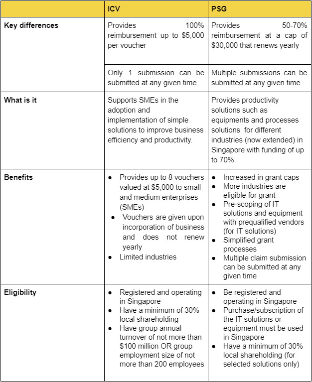 The objective of PSG is to assist businesses in accessing to a wider range of productivity solutions for business upgrading. It is a simplified grant that streamlines existing grants and benefits local businesses. The table below highlights some key differences between the ICV and PSG:
